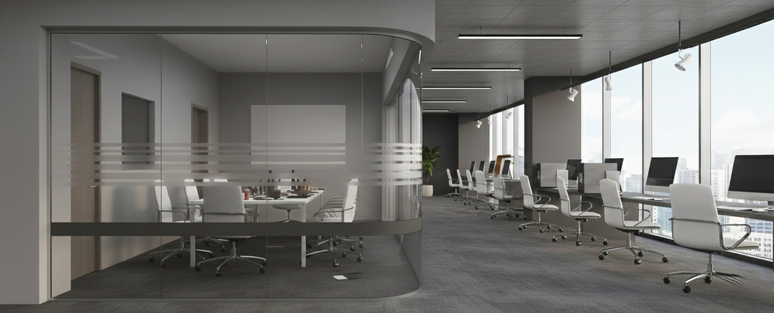 القواطع الزجاجية للمكاتب تخلق مساحات عمل مفتوحة ومضيئة مع الحفاظ على الخصوصية عند الحاجة. تساعد على تحسين الإنتاجية وتسمح بدخول الضوء الطبيعي وتمنح المكتب مظهراً احترافياً حديثاً.